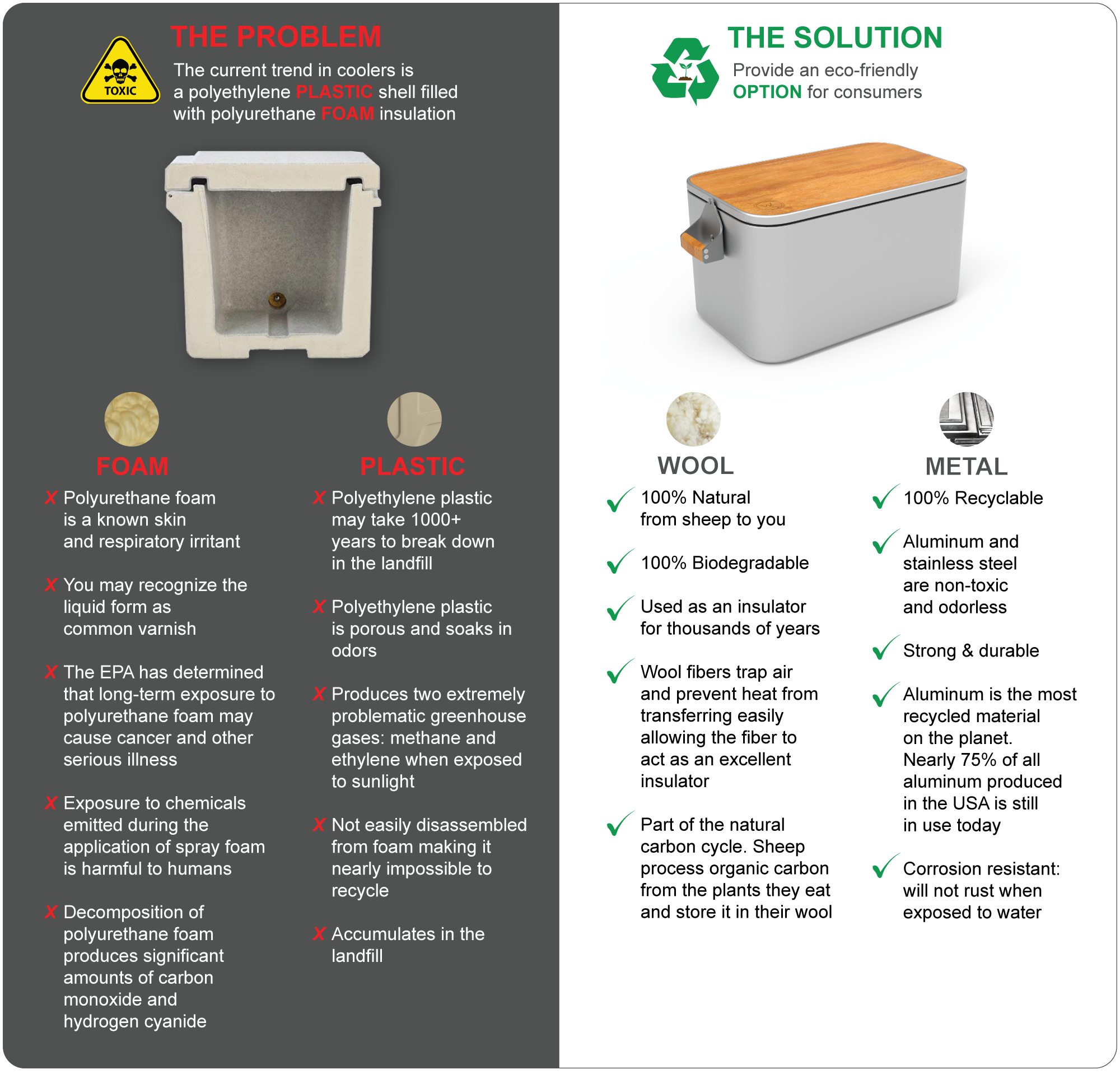 Each element of The Wooly has been thoughtfully designed with sustainability in mind. The housings and hardware are made from corrosion resistant aluminum and stainless steel, materials that can be easily recycled. The cutting board and handles are made from bamboo, a renewable and natural material. The conventional polyurethane foam insulation found in virtually all hard coolers was replaced with natural compostable wool. This patented assembly differentiates The Wooly from every other cooler on the market.